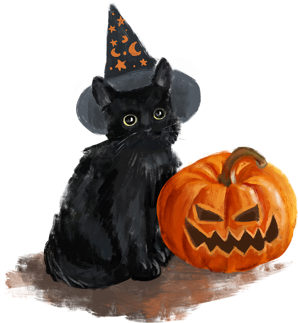 (een zelfgemaakte heksenbezem, twee hoedjes en een zelfgemaakte kat)